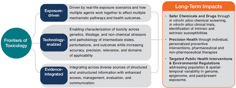 The report outlines a vision for “Toxicology 2.0,” integrating exposomics, advanced bioengineering (e.g., organ-on-chip systems), and artificial intelligence to understand how complex environmental and social exposures contribute to disease across diverse populations. The workshop emphasized transitioning to exposure-driven frameworks, leveraging emerging technologies to model human biology more accurately, and establishing interoperable data platforms for evidence integration. Long-term goals include enabling precision health, safer chemicals and drugs, and targeted environmental interventions through scalable, FAIR-compliant tools and probabilistic risk assessments. This vision requires coordinated investment in technology, ethics, data sharing, and public engagement to transform toxicology into a foundational science for 21st-century health and defense.
